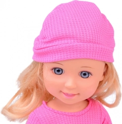 Rožnata bluza, vijolično krilo in rožnata čepica dajejo punčki eleganten videz, idealen za modno igro.