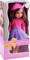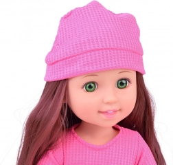 Punčka z dolgimi rjavimi lasmi, rožnato čepico in vijoličnim krilom je elegantna igrača za otroke. Premične okončine omogočajo ustvarjalno igro, realističen videz pa pritegne pozornost malih lastnic.
