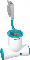 Naprava deluje tiho, zasnovana je za samodejno delovanje in obvladuje širok razpon velikosti bazenov. V paketu je tudi filtrirni vložek Tip III (58012), montažni pribor in integrirana košara skimmerja, zato lahko sistem začnete uporabljati takoj.