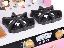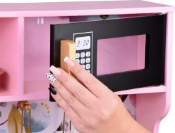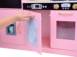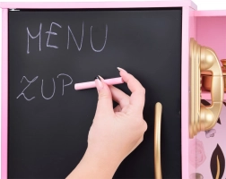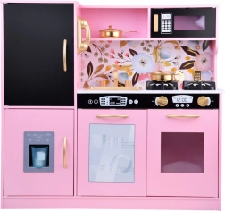 Lesena retro kuhinja v rožnati barvi z elegantnimi zlatimi elementi in cvetličnim dizajnom. Odlično spodbuja domišljijsko igro in omogoča otrokom, da postanejo mali kuharski mojstri s svojo lastno restavracijo.