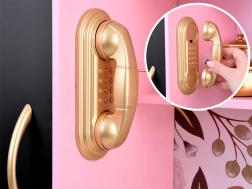 - Telefon, obešen na hladilniku, doda retro čar in ponuja zabavne možnosti igre.