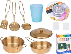 - Kuhinja vključuje lonec, kozico, pokrove, kuhalnice in celo kredo za pisanje na tablo.
