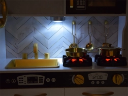 Funkcije: Ponuja vse, kar otroci potrebujejo za igro, vključno s hladilnikom, mikrovalovno pečico z zvočnimi in svetlobnimi učinki, pečico ter celo izdelovalnikom ledu. Priloženi so tudi kuhinjski pripomočki, kot so lonec, ponev, pokrov, zajemalka, cedilna žlica, lopatica in drugo.