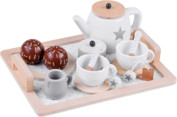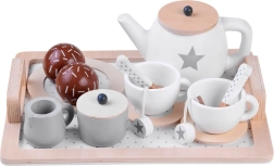 Stilski lesen čajni set v nežnih bež in belih tonih prinaša varno igro na čajanko. Vsebuje pladenj, čajnik, skodelice, krožničke, posodico za sladkor, vrček za mleko in lesene dobrote – vse z prisrčnimi motivi zvezdic in pik. Trpežna lesena izvedba, gladki robovi in netoksične barve spodbujajo domišljijo ter socialne veščine otrok.