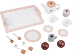 Priredite otroško čajanko z elegantnim setom na pladnju. Set je izdelan iz kakovostnega lesa in prebarvan z neškodljivimi barvami v modernih bež in belih odtenkih. Zahvaljujoč čvrsti konstrukciji in brezčasnemu dizajnu je idealen za igre vlog, posnemanje odraslih in skupne trenutke s prijatelji.