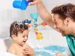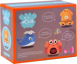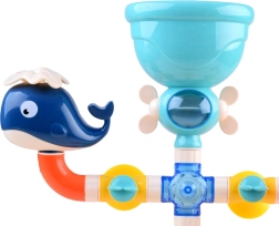 Ta interaktivni vodni set spremeni vsako kopel v igro. Vlijte vodo v zgornji lijak in opazujte, kako tok potuje skozi cevke, zavrti elemente in ustvari fontane in slapove. Dele z motivi hobotnice, kita in raka je mogoče preprosto premeščati in ustvarjati nove poti.
