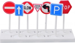 - 2 kovinska avtomobilčka, helikopter, 7 prometnih znakov, nalepke, mestna podloga