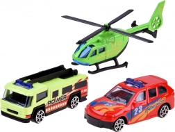 V kompletu sta 2 kovinska avtomobilčka, helikopter, 7 prometnih znakov, nalepke in velika podloga z načrtom mesta.