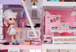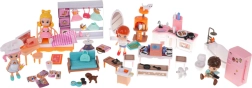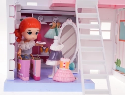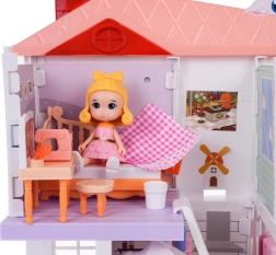 Trietična konstrukcija ponuja raznolike prostore kot so garderoba, kopalnica, kuhinja, dnevna soba in spalnica, vse opremljene s pohištvom za realistično igro.