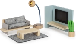 Ta lepo izdelan komplet pohištva prinaša v otroške igre realistične elemente, ki pomagajo razvijati domišljijski svet malih arhitektov in oblikovalcev. Otroci so lahko še bolj vključeni v igro zahvaljujoč možnosti menjave »televizijskega programa« z vstavnimi karticami, medtem ko stoječa svetilka pričara pravo atmosfero dnevne sobe.