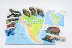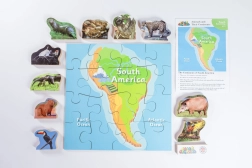 Lesena sestavljanka Južna Amerika in njene živali predstavlja izobraževalno zabavo za otroke, ki združuje spoznavanje kontinentov in njihove favne z igrivo obliko učenja.