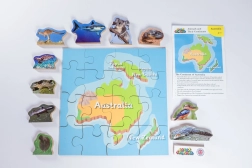 Potopite se v fascinanten svet avstralske favne z leseno sestavljanko, ki vsebuje 16 koščkov zemljevida in 10 samostoječih živali. Sestavljanka je izdelana iz kakovostnega MDF materiala, kar zagotavlja dolgo življenjsko dobo in varnost za otroke. Živali so realistično prikazane, kar spodbuja domišljijo in vizualno razumevanje.