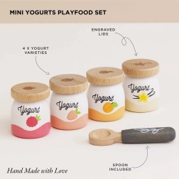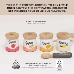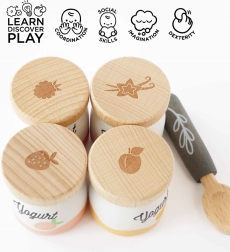 Začnite dan s kompletom lesenih jogurtov Le Toy Van! Vsebuje štiri prikupne imitacije jogurtov z okusi breskve, vanilje, maline in jagode. Leseni deli podpirajo razvoj fine motorike in otrokom omogočajo raziskovanje pomembnosti zdrave prehrane.