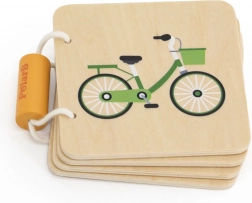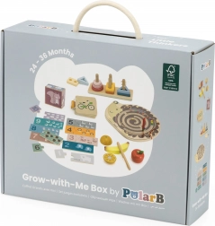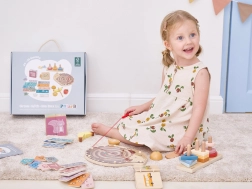 Del paketa so magnetni ježev labirint, sestavljanke in puzzle, set sadja za rezanje ter lesena knjižica s prevoznimi sredstvi. Vse je shranjeno v priročni škatli z ročajem za enostavno prenašanje. Idealna izbira za male raziskovalce, pripravljene na naprednejše naloge.
