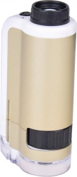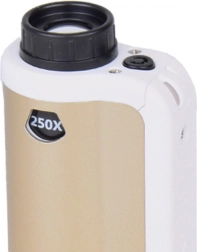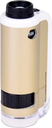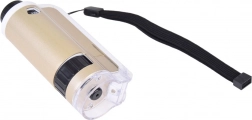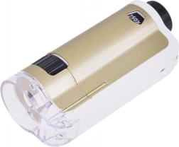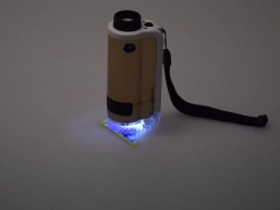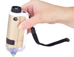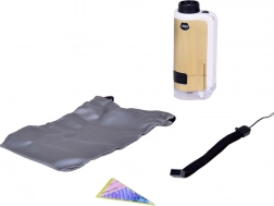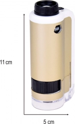Naprava je preprosta za uporabo: prislonite prozorno osnovo na površino opazovanega predmeta, z vrtljivim koleščkom izostrite in po potrebi izberite povečavo 100x ali 250x. Trpežna kovinsko-plastična izdelava, napajanje 1× AAA 1,5 V in priložena dodatna oprema ga naredijo odlično učno darilo.