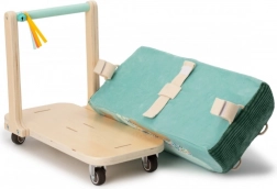Praktična zasnova združuje čvrsto leseno osnovo in udobno tekstilno sedišče z enostavno čiščenjem površine. Odstranljiva torbica sprejme drobnarije za pot, ko pa otroci malo zrastejo, sedišče preprosto snamete in se spremeni v mehko sedež-vrečo za počitek.