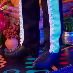 Navdušite z izraznimi vezeninami sladkornih lobanj, cvetlic in kosti, ki krasijo obleko in dodatke kot so pas in čevlji.