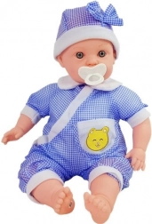 Oblečena je v modro pižamo z belimi detajli, ki jo je mogoče enostavno sleči in oprati, zato bo punčka vedno čista. Del kompleta sta tudi steklenička in duda za še bolj verodostojno nego.