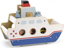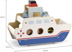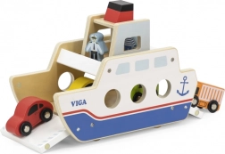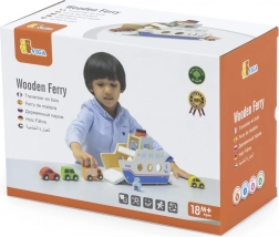 Odkrijte zabavno leseno ladjo na kolesih, ki služi kot trajekt za avtomobilčke. Zahvaljujoč preklopnim rampam na obeh straneh bodo otroci uživali v realistični igri in urili fino motoriko. Priloženi so 4 leseni avtomobilčki z prostim tekom in 2 figurici, ki spodbujata kreativno in domiselno igro.