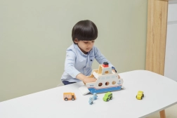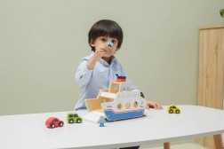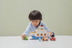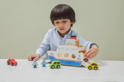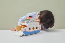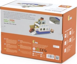 Ta kakovosten leseni trajekt bo navdušil vse male ljubitelje vozil in ladij. Ladja vozi na kolesih, zato jo je mogoče zlahka premikati, ter ima preklopne rampe na obeh straneh, da avtomobilčki lahko udobno zapeljejo nanjo in z nje. Robusten dizajn in gladki robovi so idealni za otroke od 18 mesecev dalje.