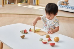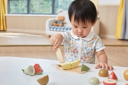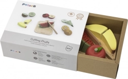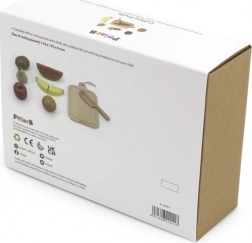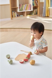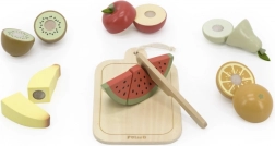 Zaradi tega lesenega seta sadja lahko otroci uživajo ure zabave hkrati pa se učijo. S pomočjo lesenega noža lahko otroci varno režejo in kombinirajo sadje po svoji domišljiji.