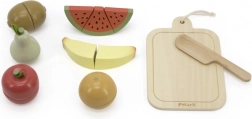 Predstavljamo vam izjemen set lesenega rezalnega sadja, ki je idealen za male kuharje in chef-kuharje! Set vključuje desko, nož in šest kosov različnega sadja, ki je razdeljeno na polovice in povezano z ježkom. Otroci si tako lahko ustvarjajo lastne kombinacije sadja in varno vadijo rezanje.