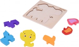 Šest večjih delov in lesena podlaga s silhueto slona olajšata pravilno vstavljanje ter krepita otrokovo samozavest pri igri.