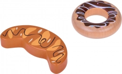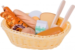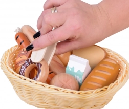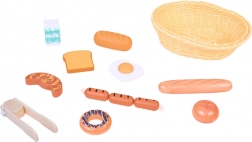 Bageta, žemlja, toast, rogljiček, krofi, klobasice, jajce in mleko – verne oblike in barve vabijo k igri kuhanja ali trgovinice.