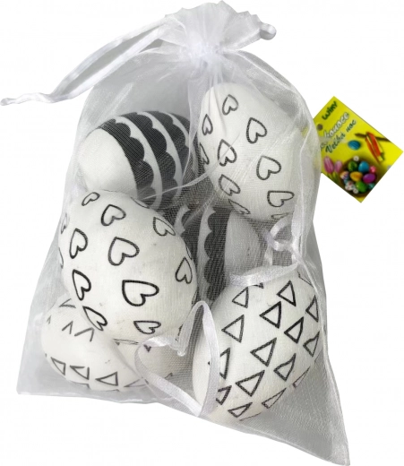 Črno-bela dekorativna plastična jajca so popolna izbira za tiste, ki iščejo sodoben in domiseln dodatek za svoj dom. Jajca so izdelana iz trpežne plastike in so pakirana v organza vrečki s šestimi kosi.