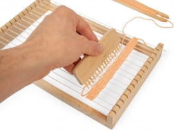 Vsebuje vse potrebne pripomočke in preje za ustvarjanje unikatnih tkanin, vključno z lesenim glavnikom, čolničkom in barvnimi niti.