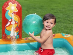 Napihljivo igralno središče BESTWAY Retro Groove bo vaš vrt spremenilo v pisano vodno igrišče. Stabilen tobogan trdno pritrjen na dno vodi v plitek bazenček, za osvežitev pa poskrbi vodna prha, ki jo preprosto priključite na cev. Retro grafika in dodatki v obliki žogic ter plažnega balona spodbujajo ustvarjalno igro in razvoj motorike.