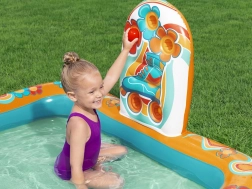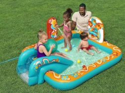 Vstopite v svet poletne zabave z napihljivim igralnim centrom BESTWAY Retro Groove. Barvit bazenček s toboganom, vgrajenim vodnim pršilnikom in igračami za razvrščanje žogic prinaša otrokom od 2 let varno in igrivo vodno atrakcijo. Enostavna priključitev na vrtno cev, odtočni ventil za hitro izpraznitev in možnost igre tudi brez vode naredijo to središče idealno izbiro za vrt in teraso.