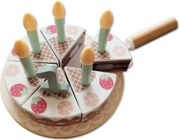 Lesena rojstnodnevna torta v privlačnem »jagodno-čokoladnem« dizajnu je idealna za otroške kuhinje in praznovanja. Šest rezalnih kosov je povezanih z močnim ježkom, zato lahko otroci torto zlahka razdelijo na porcije in jo ponovno sestavijo. V kompletu so svečke, številke 1–5, kartica z voščilom in lopatica za serviranje.