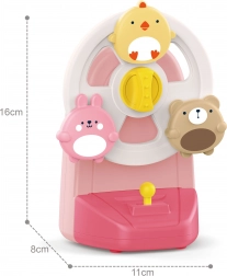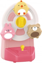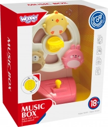 Piščanček, zajček in medvedek se ob zagonu zavrtijo in otroka spremljajo s prijetno melodijo pozitivke. Zabava, ki spodbuja vid in sluh.
