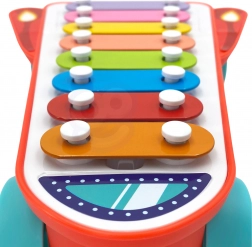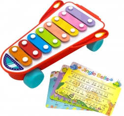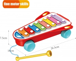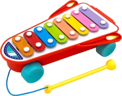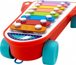 Xilofon deluje kot glasbena naprava in kot barvita vlečna igrača zahvaljujoč trdnim kolesom in pritrjeni paličici.