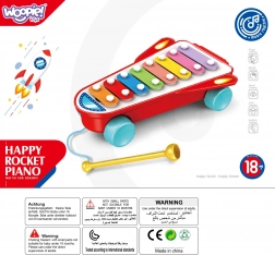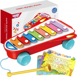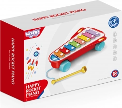 Xilofon Vesoljska Raketa Rdeča je idealen za otroke od 18 mesecev starosti. Ta dvonamenski inštrument lahko služi tudi kot vlečna igrača. Barvit in privlačen dizajn vabi k igri, otroci pa ga lahko enostavno vlečejo za seboj zahvaljujoč trdnim kolesom. Izdelan iz varnih materialov, xilofon zagotavlja čist in dolgo trajajoč zvok in vključuje 8-tonsko lestvico. Paket vključuje tri obojestranske notne kartice s priljubljenimi melodijami in paličico za igro.