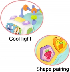 Vključuje oblikovni sortirnik z barvnimi kockami, ki pomaga razvijati očesno-ročno koordinacijo in prepoznavanje oblik.