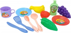 Krožniki, lonček, pribor, sadje in zelenjava ter steklenička za »detergent« – vse, kar mali pomočnik v kuhinji potrebuje.