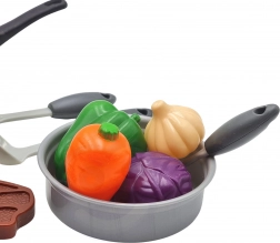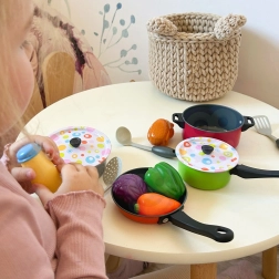 Lonci s pokrovkami, ponev in barvite sestavine omogočajo otrokom posnemati pravo kuhanje ter razvijati domišljijo in fino motoriko.