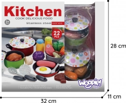 Z setom WOOPIE bo vaš otrok dobil svojo mini kuhinjo: lonce s pokrovkami, ponev, skodelo, začimbe in bogat izbor živil od jajčka in klobasice do ribe, zelenjave ali steaka. Zahvaljujoč realistični zasnovi in živim barvam razvija domišljijo, fino motoriko in socialne veščine pri igri kuhanja.