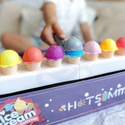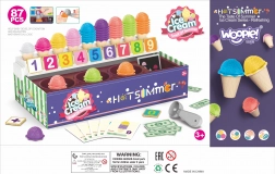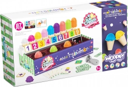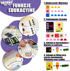 Igralni komplet sladoledarnice znamke Woopie ponuja ne le zabavo pri igri prodajalca sladoleda, temveč tudi učenje števil, barv in osnovnega seštevanja. Vsebuje 87 delov, vključno s kepicami sladoleda, korneti, naročilnimi karticami, denarjem, žetoni s številkami in zajemalko za sladoled.