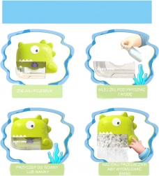 Uporaba je preprosta: nalijte 5–30 ml pršila/gel za prhanje, dolijte vodo v razmerju 1:5, dobro premešajte in zaženite. Več gela pomeni več mehurčkov. Na voljo so 3 načini – mehurčki z glasbo, utišana glasba ali izklop – za popolno vzdušje med kopanjem.