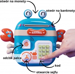 Ljubek elektronski hranilnik v obliki raka znamke WOOPIE pomaga otrokom od 3 let, da se učijo varčevati. Nudi varno shranjevanje kovancev in bankovcev, PIN kodo, simuliran čitalnik prstnega odtisa in interaktivne zvoke. Večnamenska zasnova (hranilnik, sef in nahrbtnik) iz odporne plastike je varna za otroke in na zabaven način razvija finančne veščine.