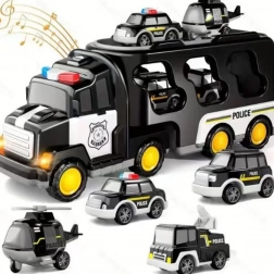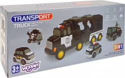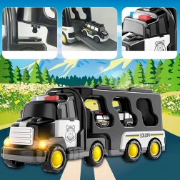Velik policijski set znamke Woopie prinaša 5v1 zabavo: ogromen transportni vlačilec in štiri policijska vozila (oklepnik, cisterna z vodnim topom, helikopter, radiovozilo). Dovolj je pritisniti gumb na kabini in sprožijo se utripajoče luči in realistične sirene. Trpežna zasnova, interaktivni učinki in premični elementi spodbujajo ustvarjalnost in domišljijo otrok že od 3. leta dalje.