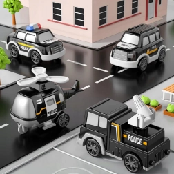 Odkrijte akcijski policijski svet z veliko prevozno garnituro WOOPIE. Otroci zlahka naložijo miniavte na ploščad in se odpravijo na posredovanje – od cestne patrulje in zračne podpore do intervencij z vodnim topom. Igra je zahvaljujoč svetlobnim in zvočnim učinkom še bolj realistična in navduši male navdušence za dolge ure.