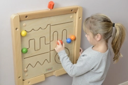 Lesena izobraževalna tabla Masterkidz z različnimi ukrivljenimi potmi in barvnimi gumbi pomaga otrokom razvijati fino motoriko in prostorsko orientacijo.