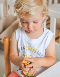 Nizanje vrvice skozi lesene dele otroke uči natančnih gibov prstov in izboljšuje koordinacijo oko–roka. Zabava, ki naravno razvija spretnosti.