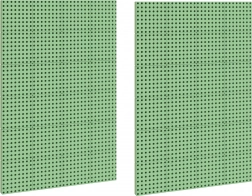 Dva zelena panela z gosto mrežo lukenj, idealna za pixel‑art in mozaike iz žebljičkov – razvoj ustvarjalnosti in fine motorike.