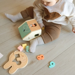 Leseni sortirnik s pokrovom in izrezi spodbuja otroke k prepoznavanju oblik in barv ter krepi koordinacijo oko–roka in prostorsko predstavo.
