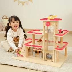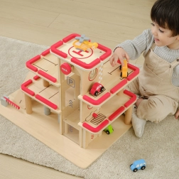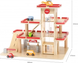 V paketu so 4 leseni avtomobilčki, helikopter ter elementi za vstop in izstop. Jasne oznake parkirnih mest, avtopralnica in zapornice podpirajo realistične scenarije in učijo otroke koordinacijskih veščin.